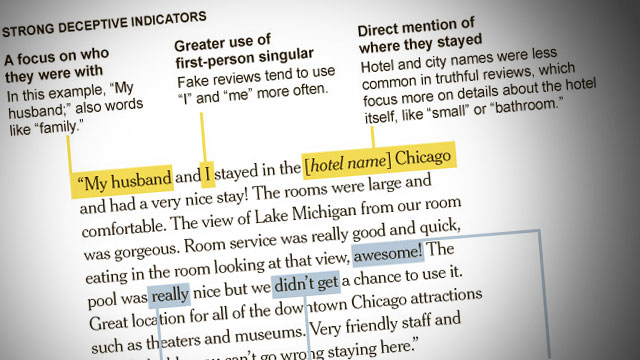 Lifehacker recently had an article about how to spot fake reviews. For instance, fake reviews usually mention the business name and use “I” or “me” a lot more often than genuine reviews.