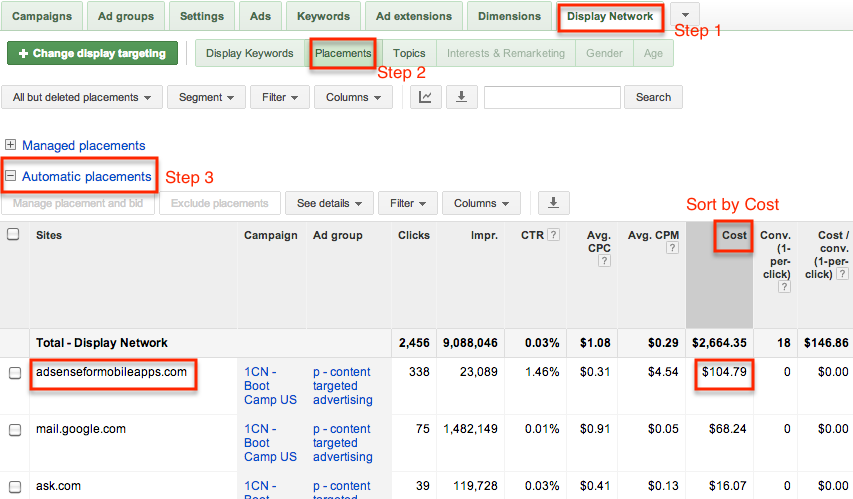 Right after a campaign goes live, or after certain account changes, sometimes a few domains will see very high impressions and clicks. At this point, we just want to exclude domains (placements) based on high cost and no conversions. In this first sort, you may also see high conversion costs or even what appears to be targeting to the wrong audience. We’ll check those issues as we pull more detailed reports later.