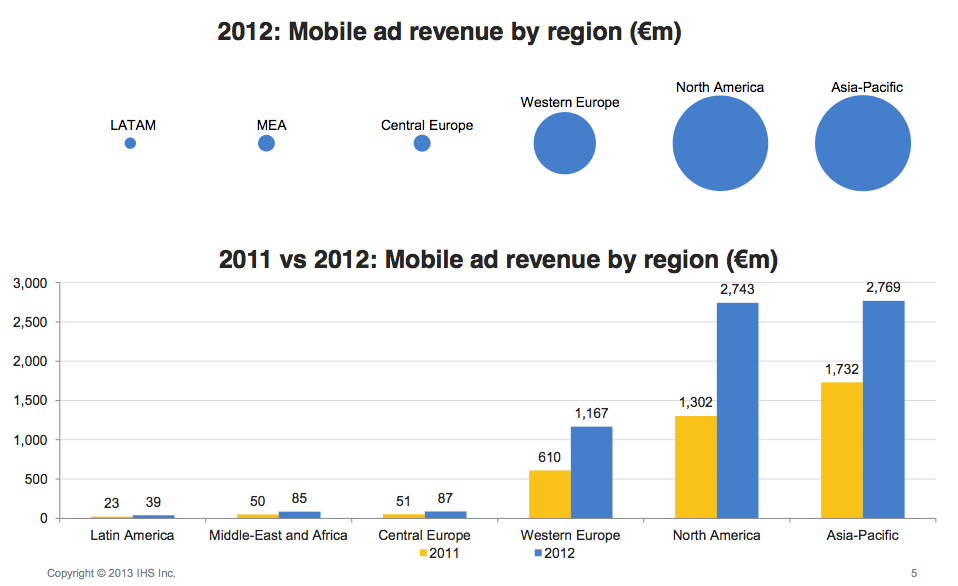 North America gained market share in 2012 and nearly caught up to Asia-Pacific in 2012. The two regions dominate the mobile ad market.