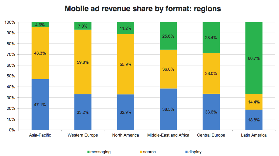 Search advertising dominated the mobile ad market, commanding 52.8 percent of total global mobile advertising revenue, or $4.7 billion in 2012. That’s up from 89 percent from $2.5 billion in 2011. Display advertising also grew at a solid clip of 87.3 percent to claim 38.7 percent of the pie, while messaging chipped in just 8.5 percent of mobile ad revenues. The chart below illustrates the wide differences in format distribution across regions. Messaging, almost non-existent in leading regions, remains dominant in Latin America where smartphone adoption lags.