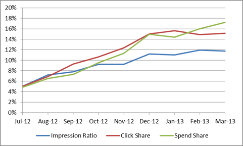 Another effect of having a marketplace that is not inventory-constrained is that ad placement can change rapidly from day-to-day or even hour-to-hour, resulting in unpredictable spikes in performance and volume. However, now that the marketplace is starting to mature somewhat, performance seems to have become somewhat less volatile, making certain analyses possible.